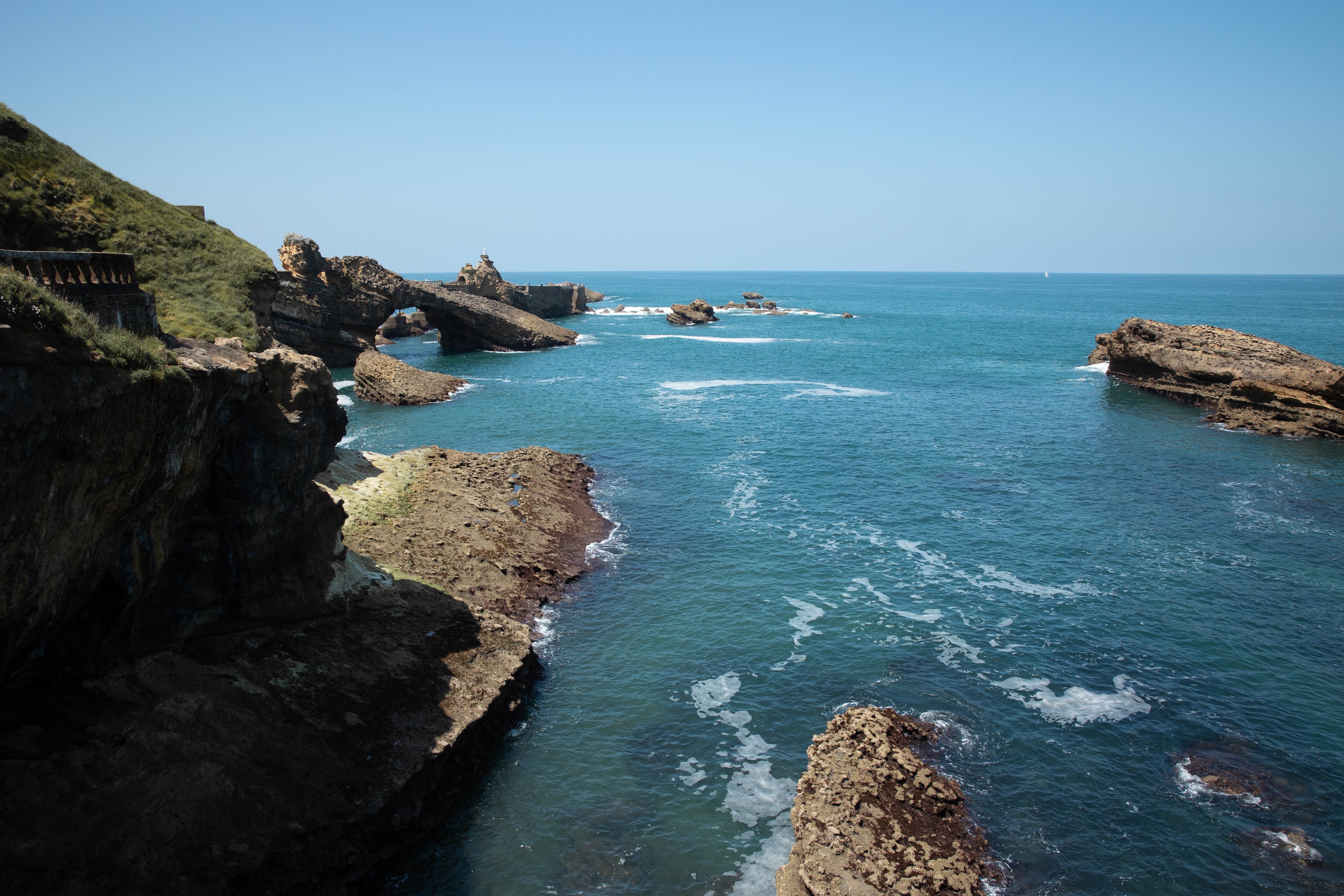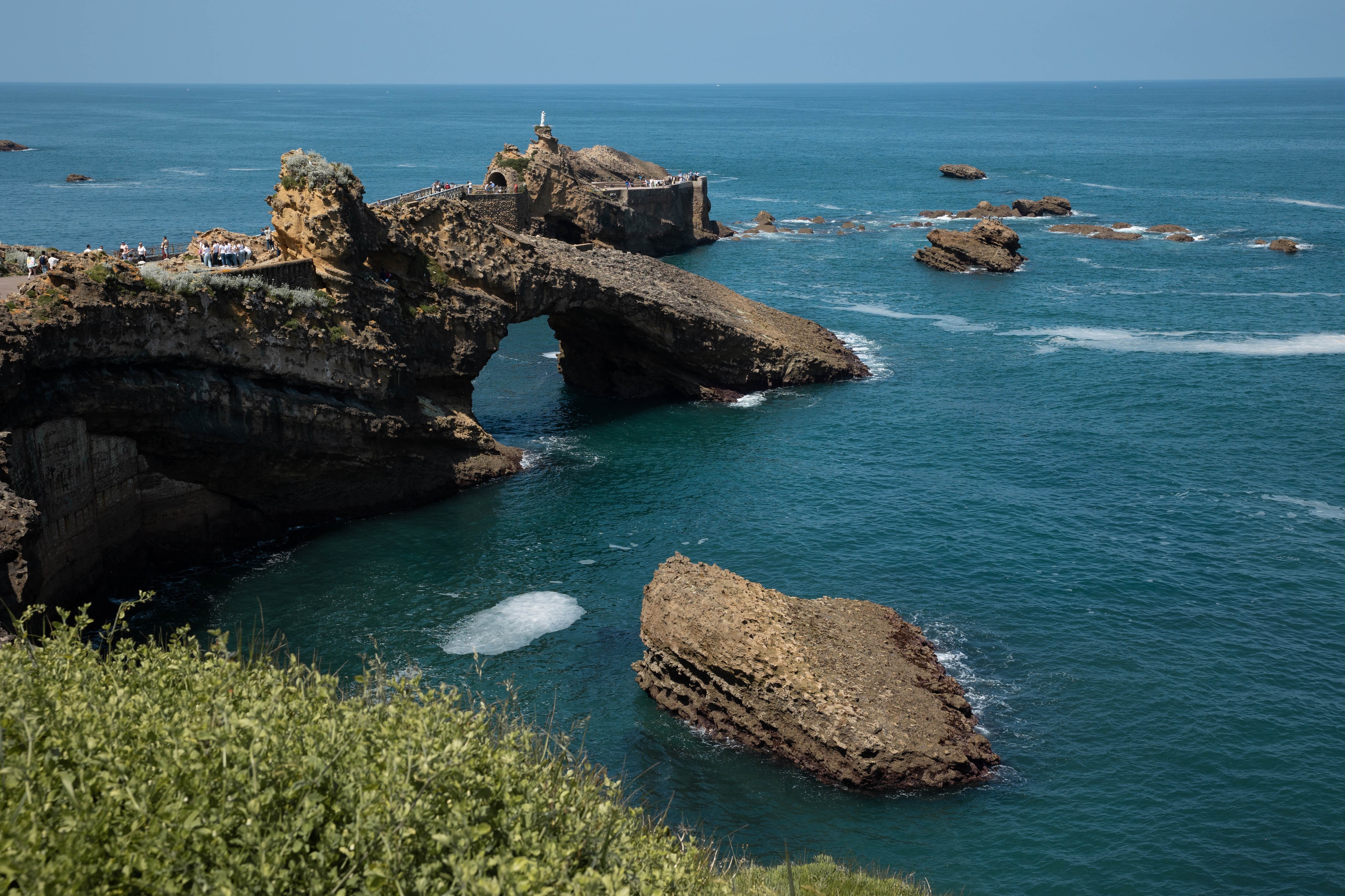 Выходим из кафе на обзорную площадку (ее видно из окна, Place Bellevue) и спускаемся на набережную. В Биарриц потрясающей красоты пейзажи, и именно за ними я и приехала. Первое место для любования — Утес Святой Девы — скалы, увенчанные скульптурой Девы Марии с младенцем, к которым ведет небольшой мостик. Больше всего в Биарриц меня впечатлили стихия и простор, бушующие волны океана, ярко бирюзовая вода и невообразимой формы скалы — природа во всем ее великолепии. Кажется, что утес находится далеко, но на самом деле от Miremont идти максимум минут 15, ну, а дальше как уже вам нравится, можно блуждать по многочисленным дорожкам столько, сколько есть времени.