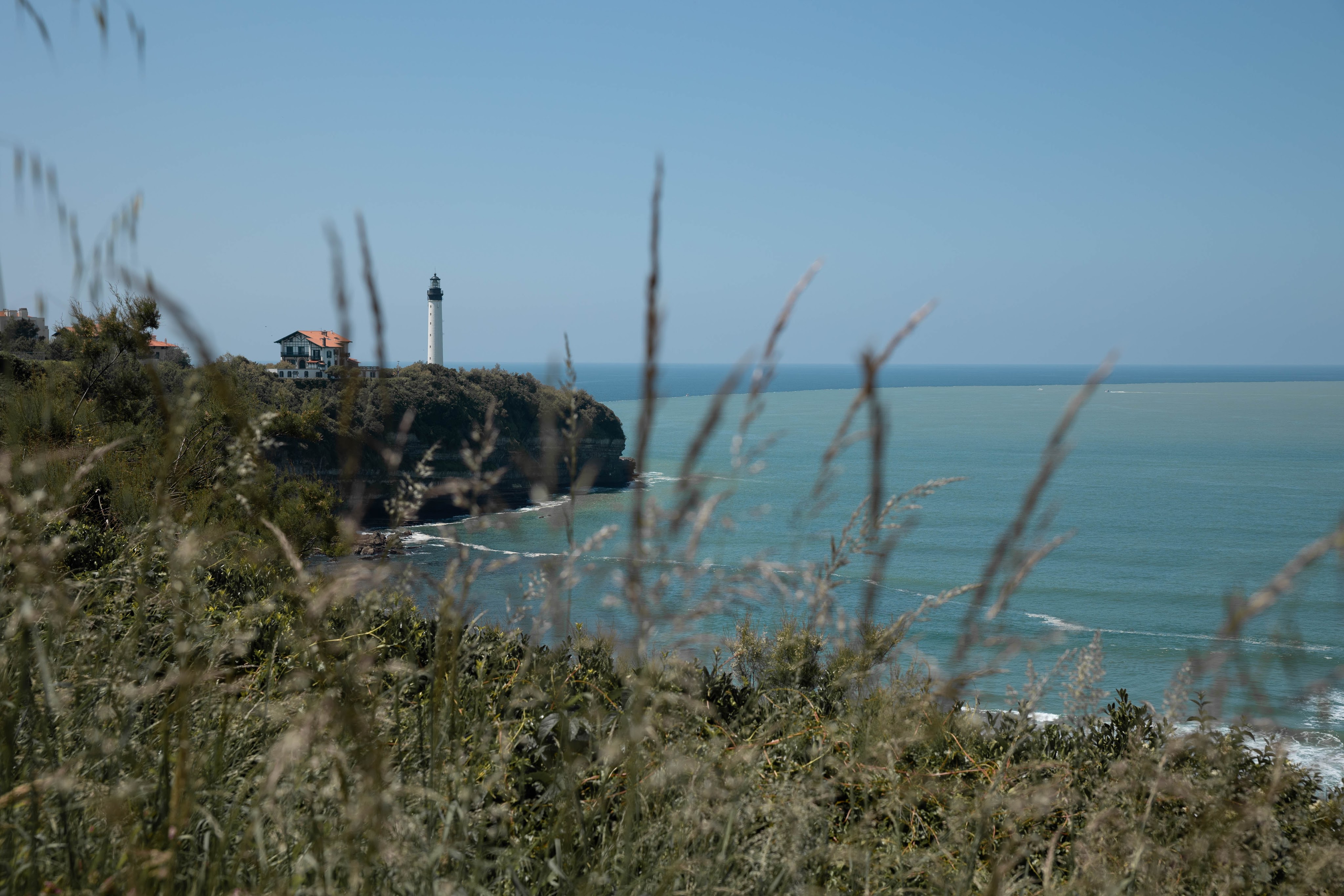 Дальше можно вернуться в город, а можно спуститься к пляжу Де Ла Шамбр: нужно пройти немного по частному сектору, заодно поразглядывать особняки, а затем спуститься по некрутой дороге: здесь открывается немного другой, но тоже очень красивый вид на маяк.