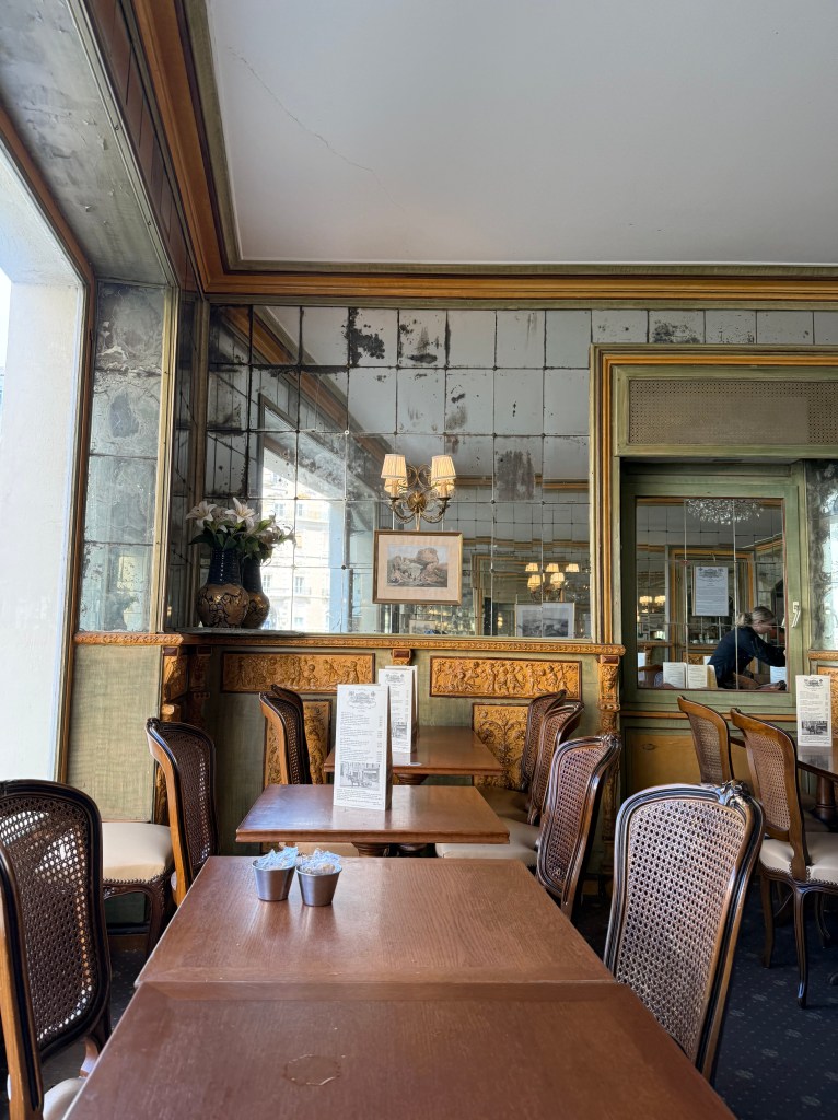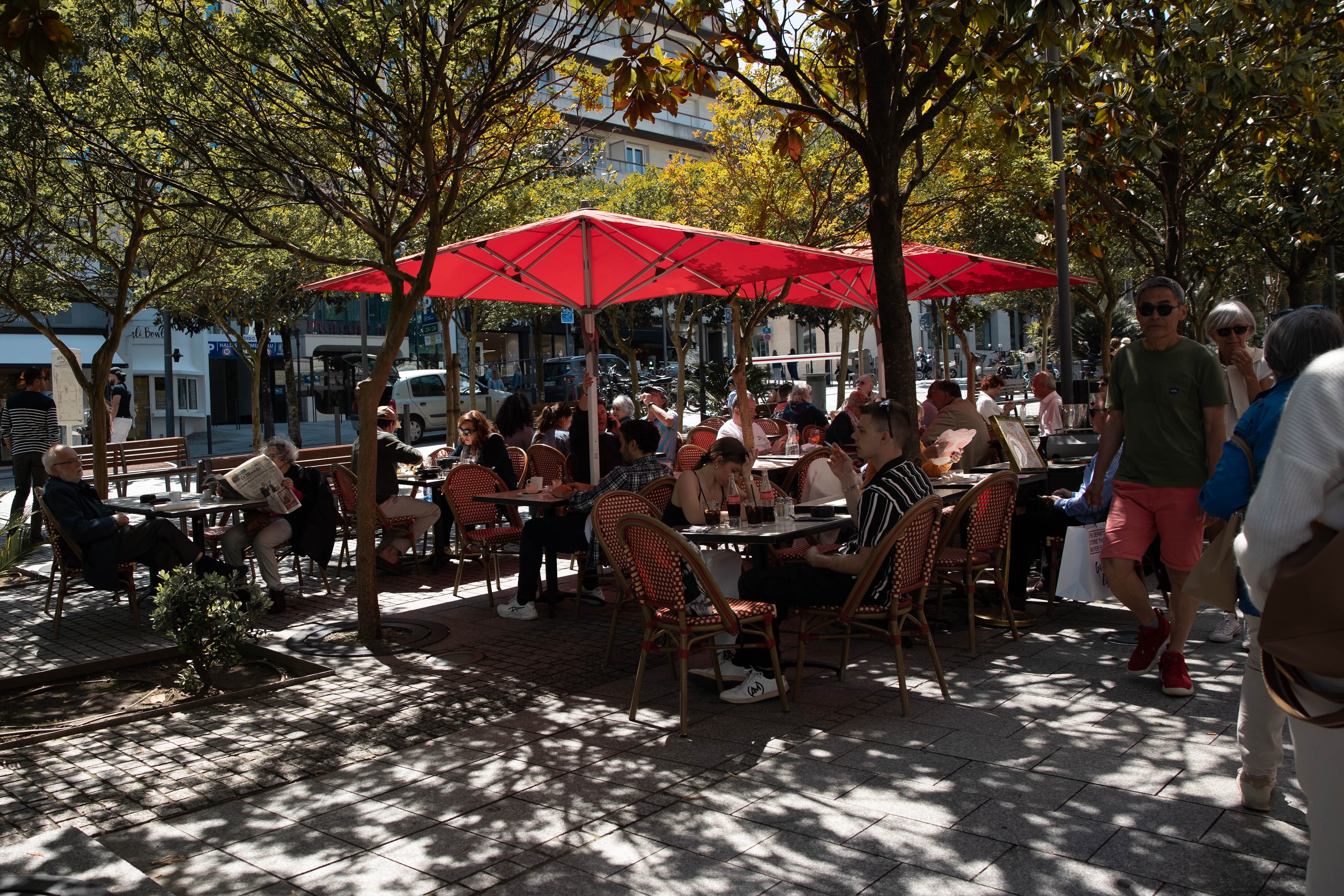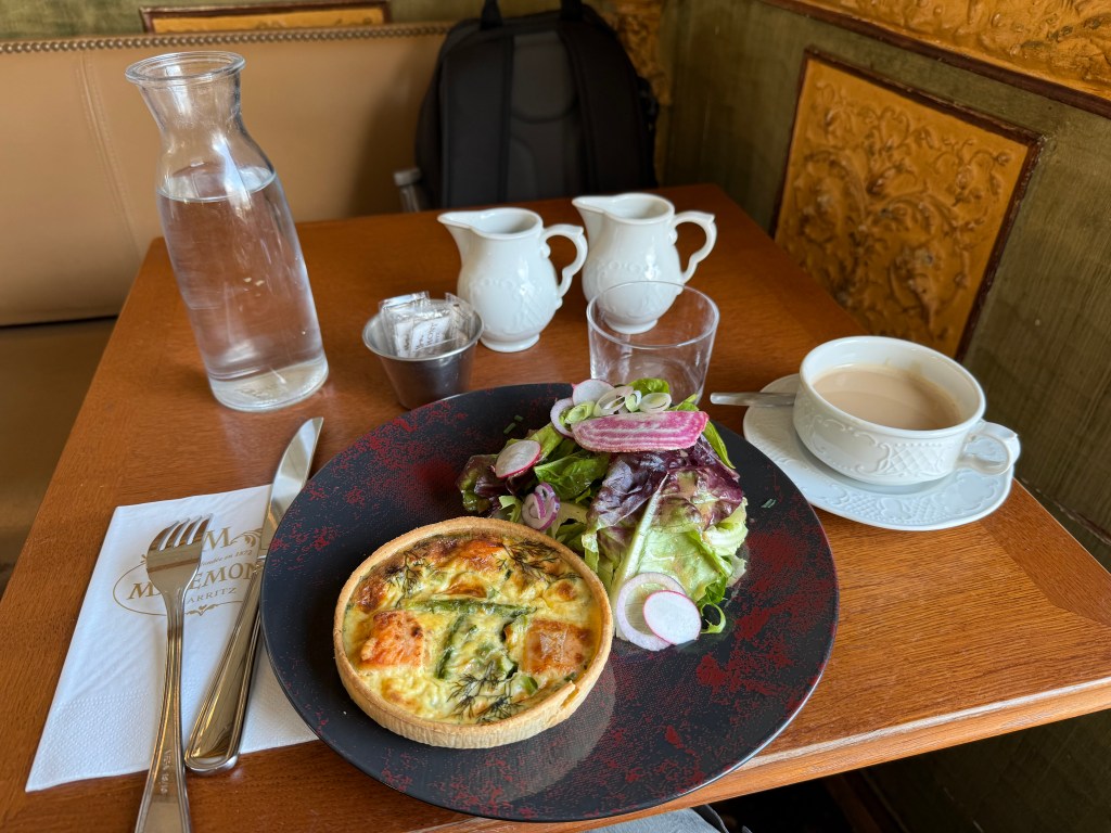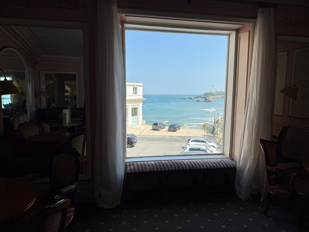 Выходим на остановке и оказываемся в самой гуще курортной жизни: тут и всякие кондитерские и миленькие маленькие магазинчики с приятными вещицами. Здесь же старинная чайная 19-го века Miremont из Белль Эпок, с большим панорамным окном на маяк и сохраненными интерьерами, в которых когда-то любили бывать короли и королевы Испании, Португалии и других стран. Так вышло, что я просто наткнулась на эту чайную, поняла, что жутко хочу есть после дороги и не готова идти дальше, ну, и в общем, решила пообедать в историческом месте. Больше всего мне понравился вид на маяк. Интерьеры для кафе интересные, меню переоценено и не стоит того, особенно кофе за 8 евро не дает мне покоя, но киш с лососем был нормальный.